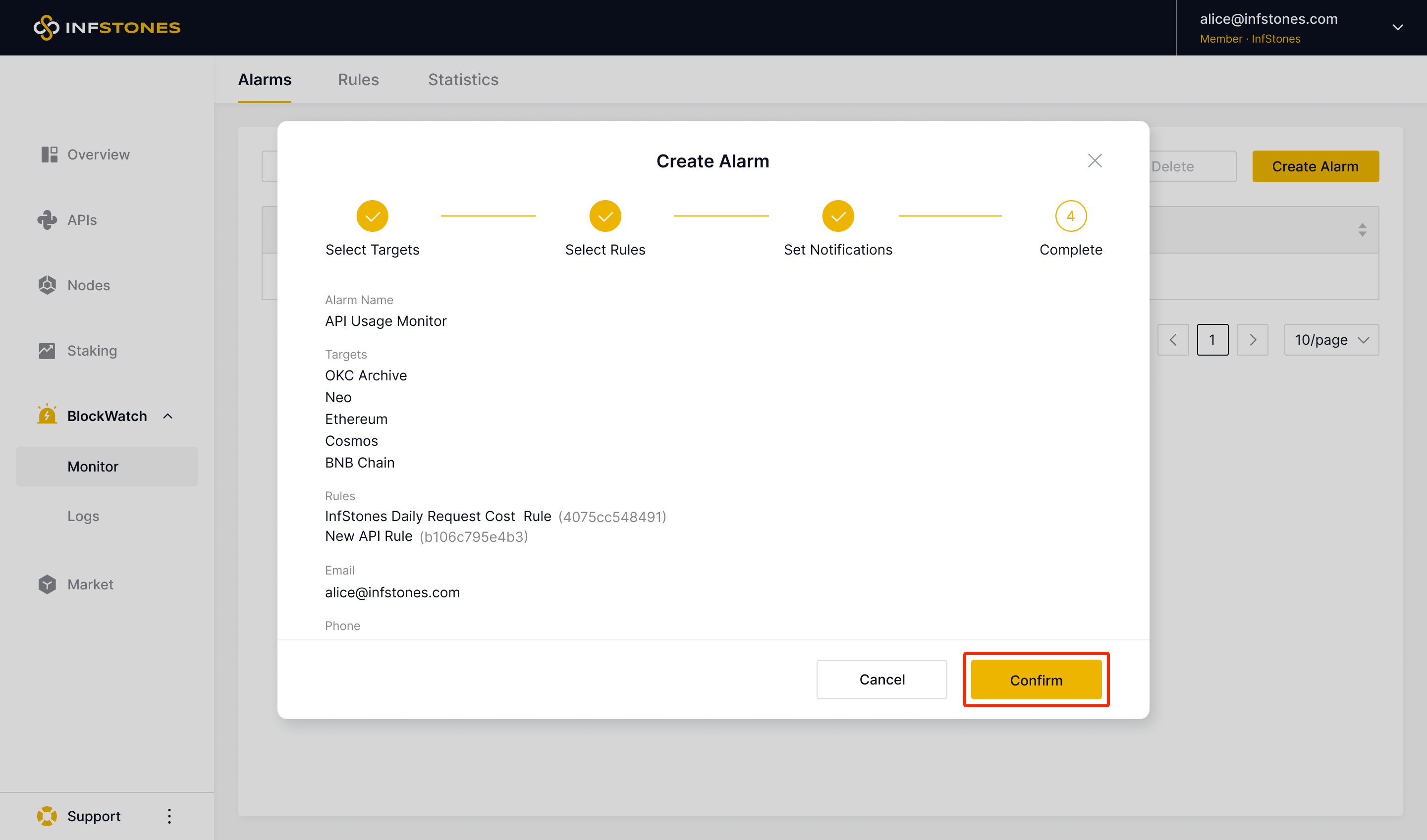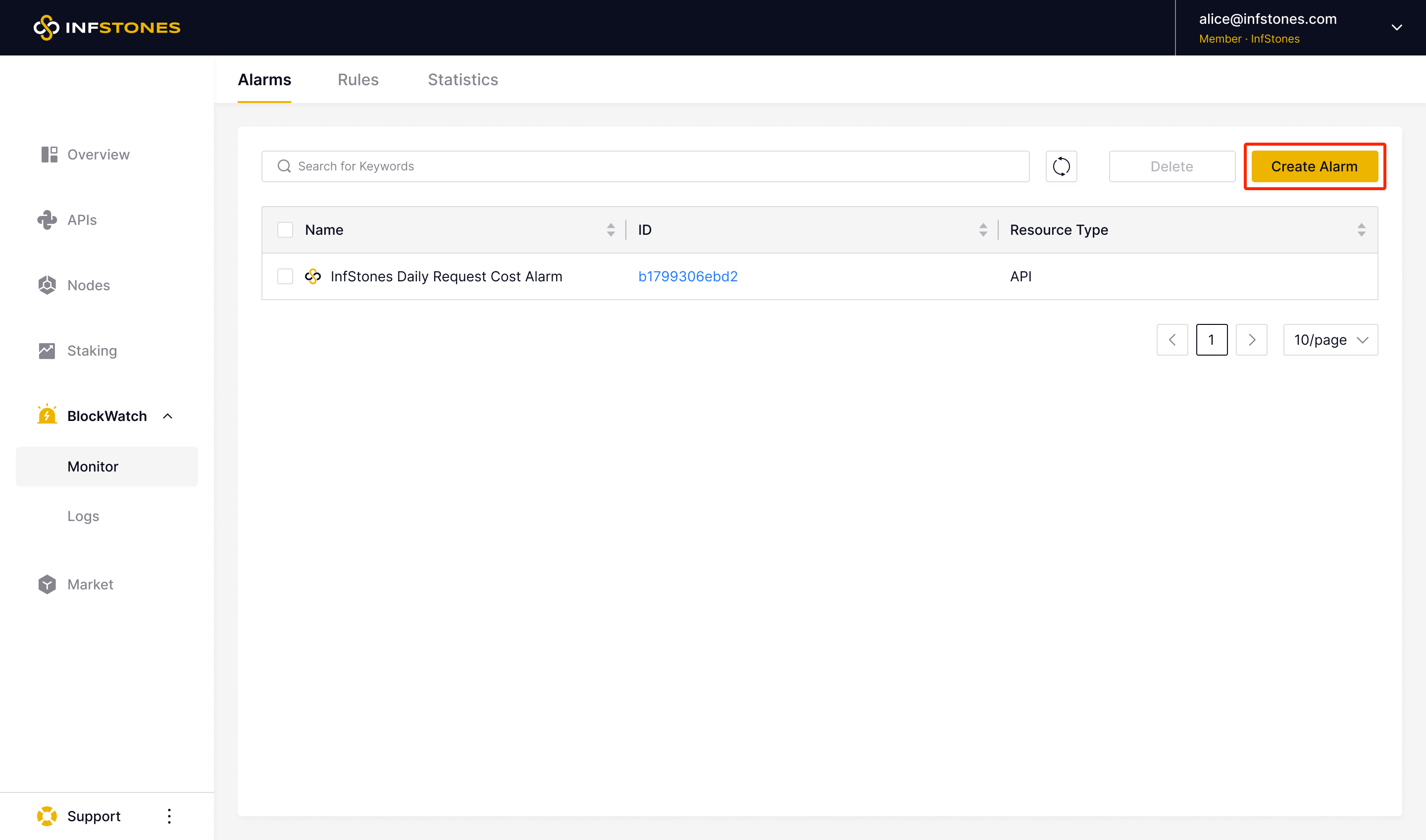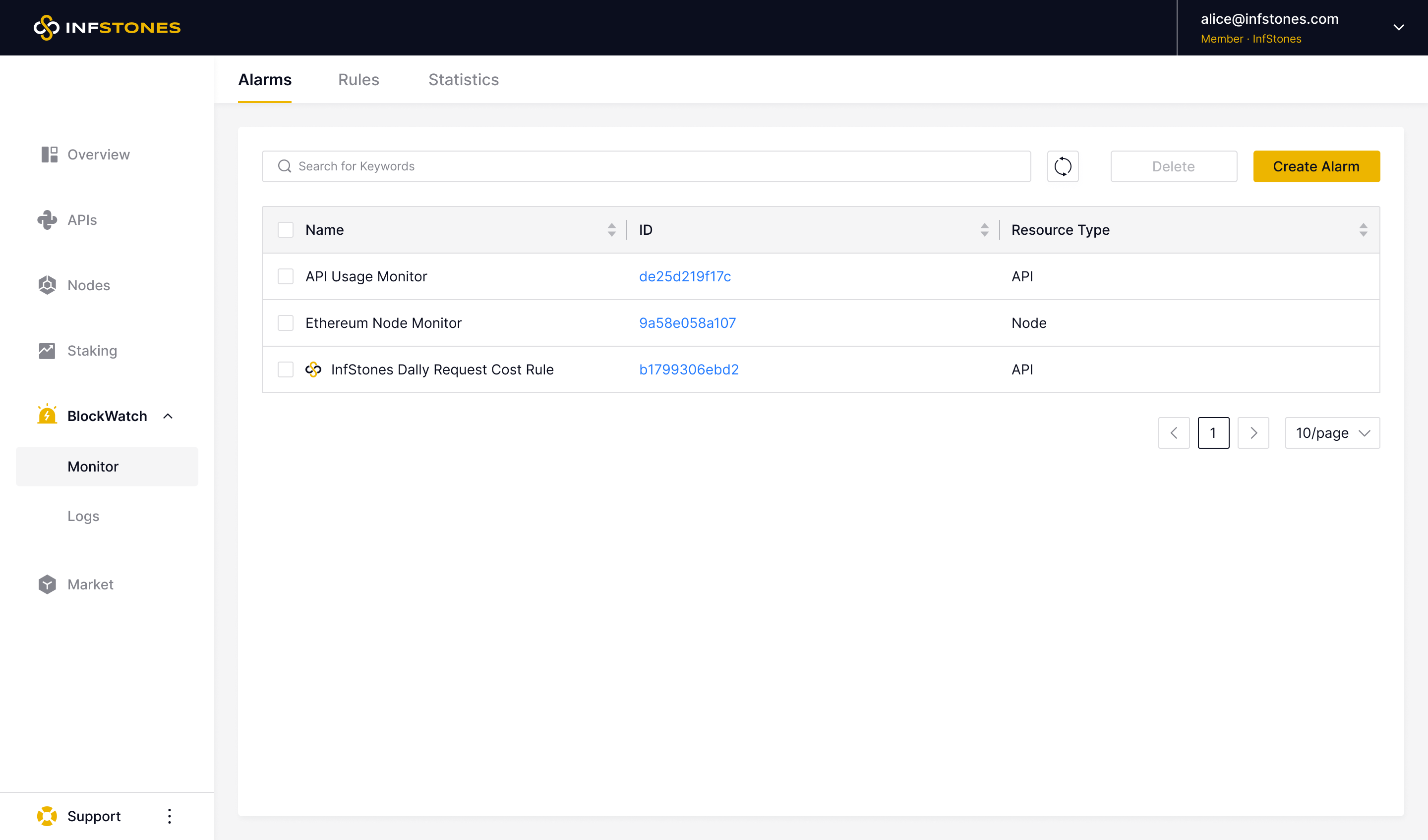 InfStones provides a comprehensive suite of tools designed to enhance the monitoring of your API projects and launched nodes. Among these tools, Alarms serve as notifications that alert you when specific conditions, defined by associated rules, are met. They can be customized with specific targets, triggers, and notification methods. Through the use of Alarms, you can proactively address any potential issues by monitoring API usage, node status, and resource utilization.