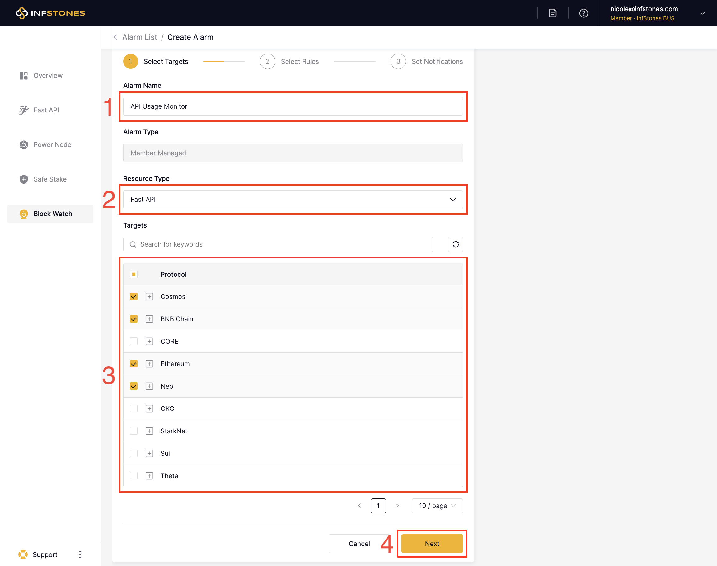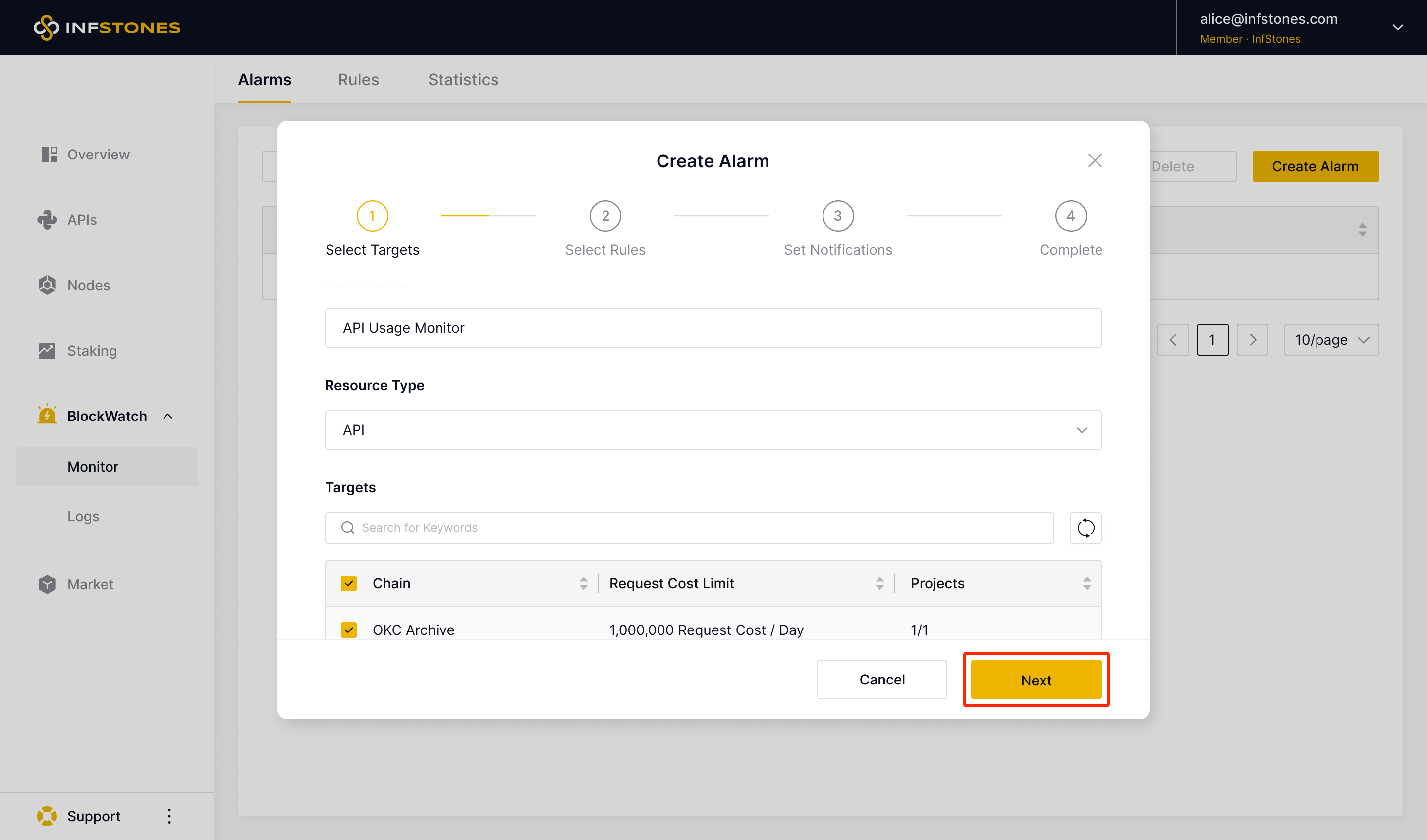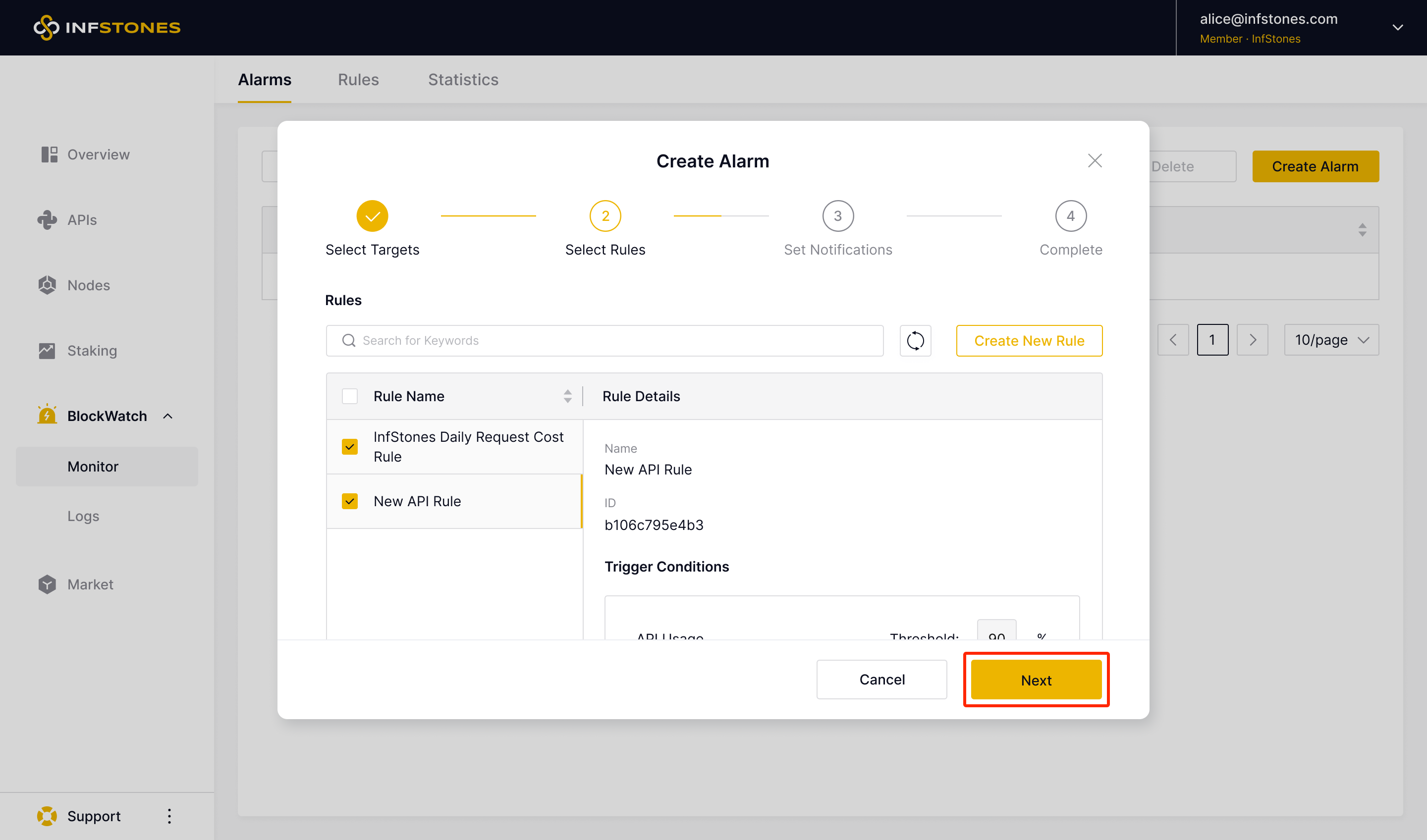 InfStones provides a comprehensive suite of tools designed to enhance the monitoring of your API projects and launched nodes. Among these tools, Alarms serve as notifications that alert you when specific conditions, defined by associated rules, are met. They can be customized with specific targets, triggers, and notification methods. Through the use of Alarms, you can proactively address any potential issues by monitoring API usage, node status, and resource utilization.