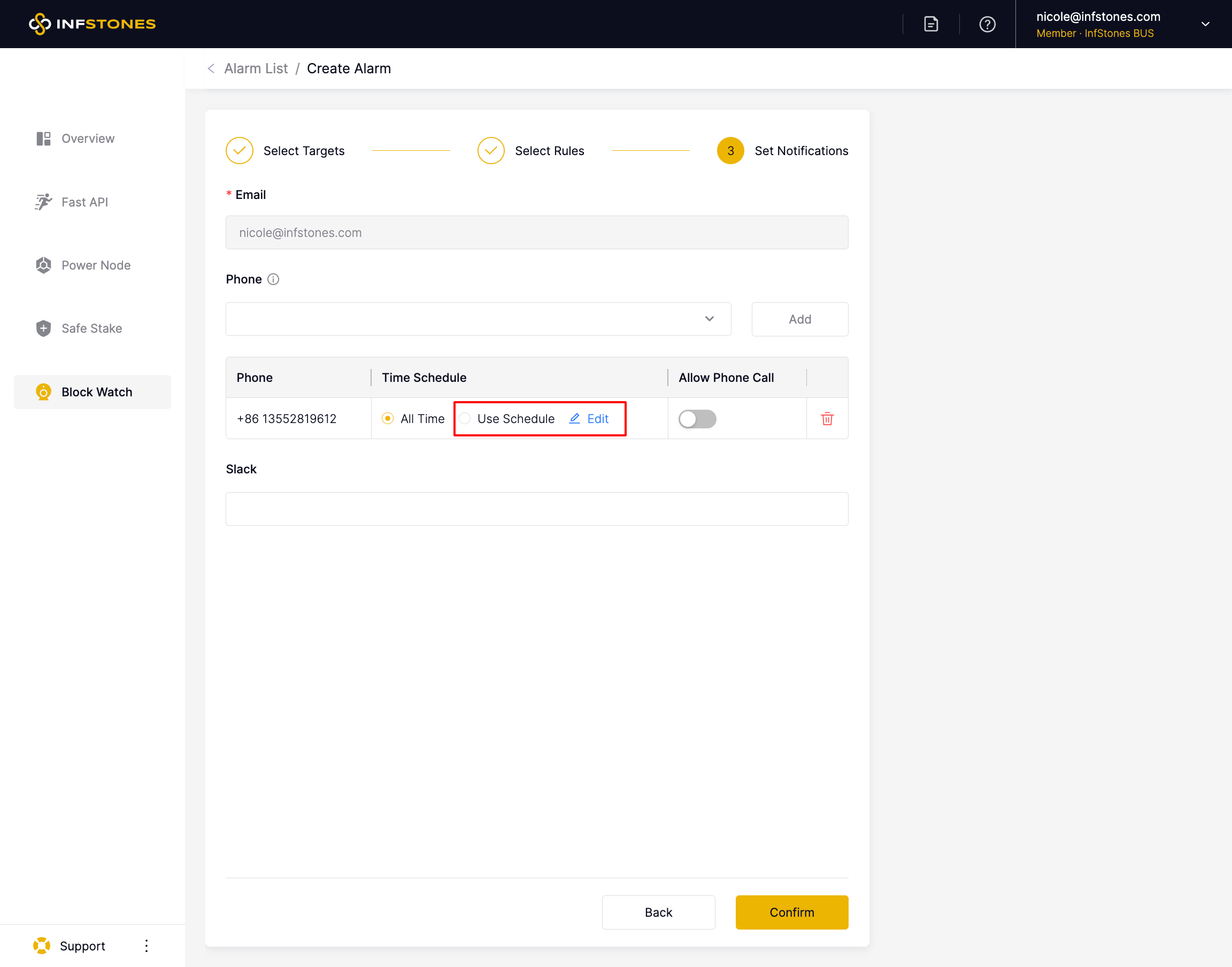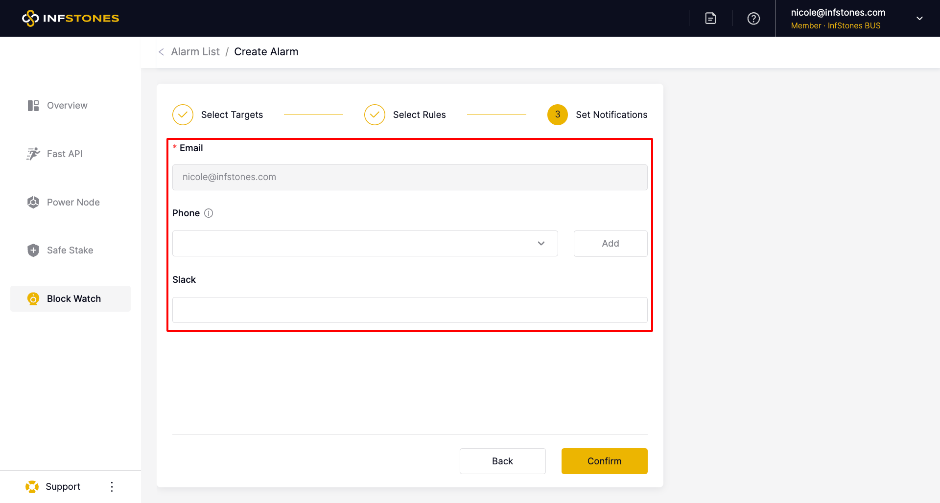 To create an alarm for Power Node, go to Block Watch page, click the Create Alarm button, and you will forward to the Create Alarm page.