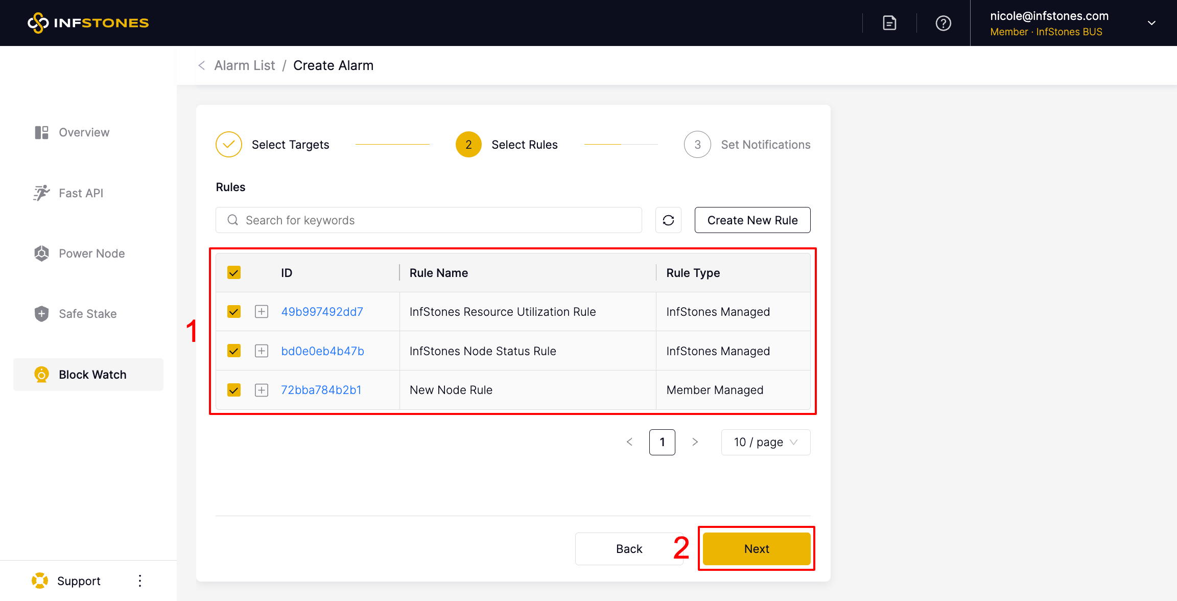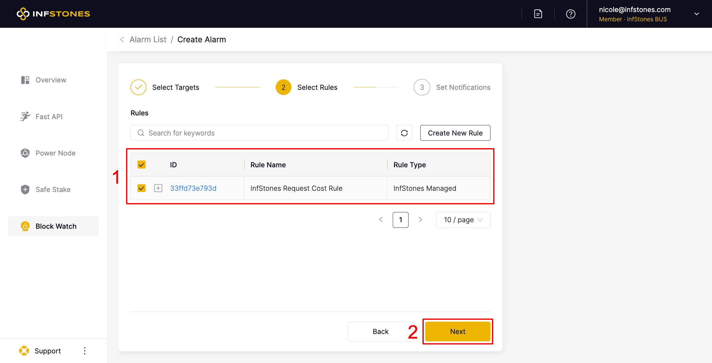 You can either select from existing rules or quickly create a new one by selecting the Create New Rule option. Once you have selected the desired rules, click the Next button to proceed.