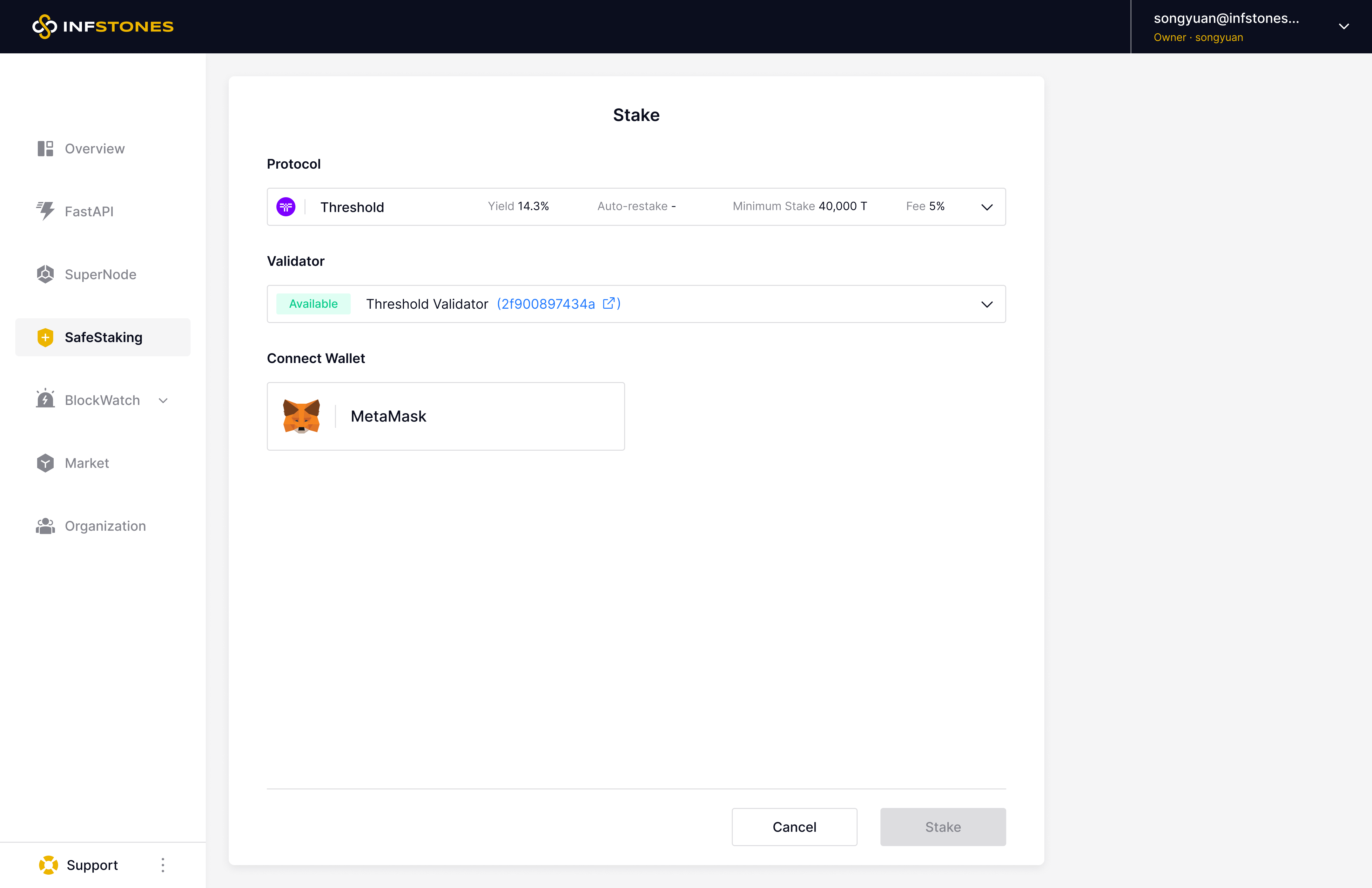 Navigate to Safe Stake on your InfStones dashboard and click Stake Now button.
