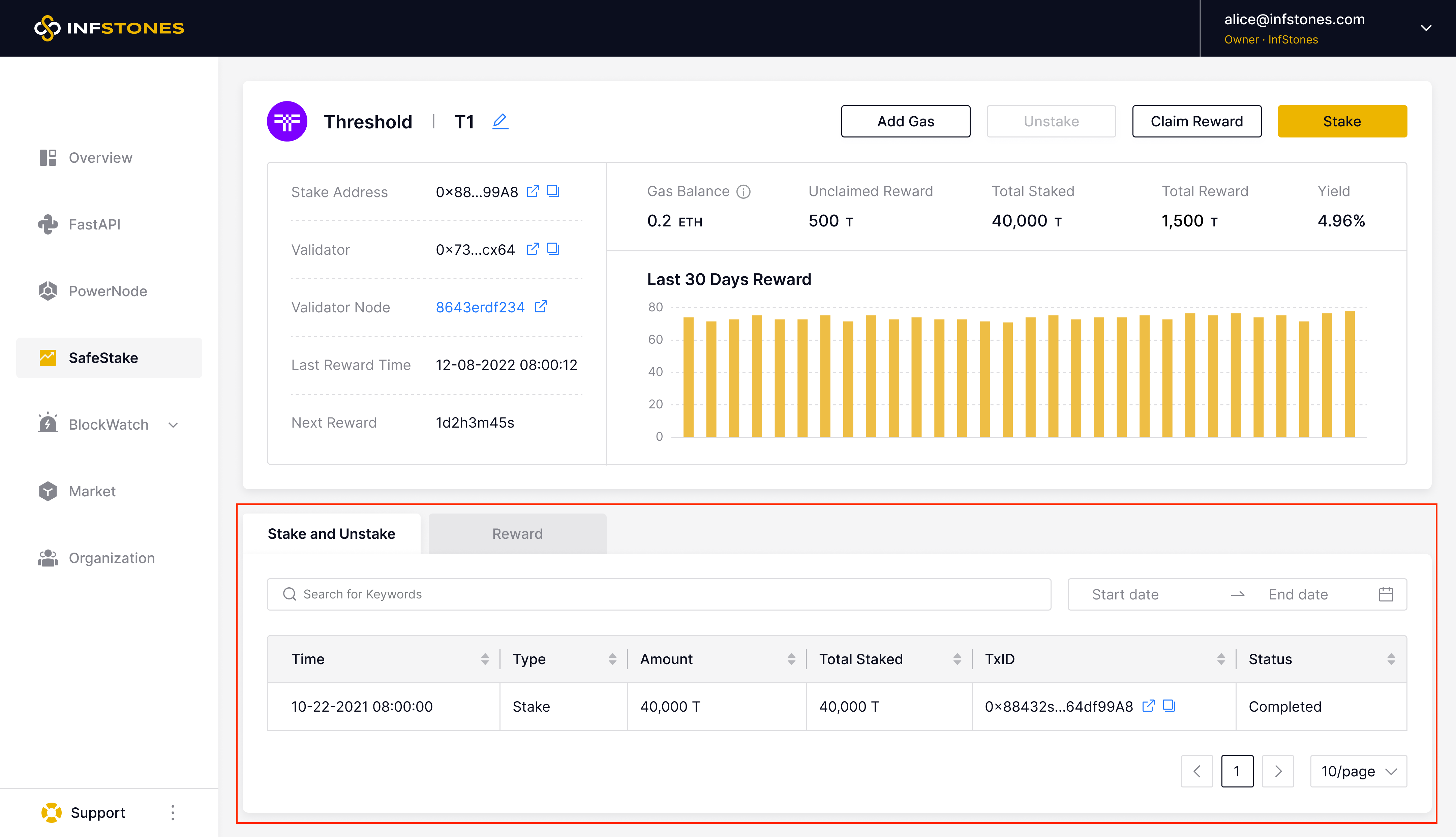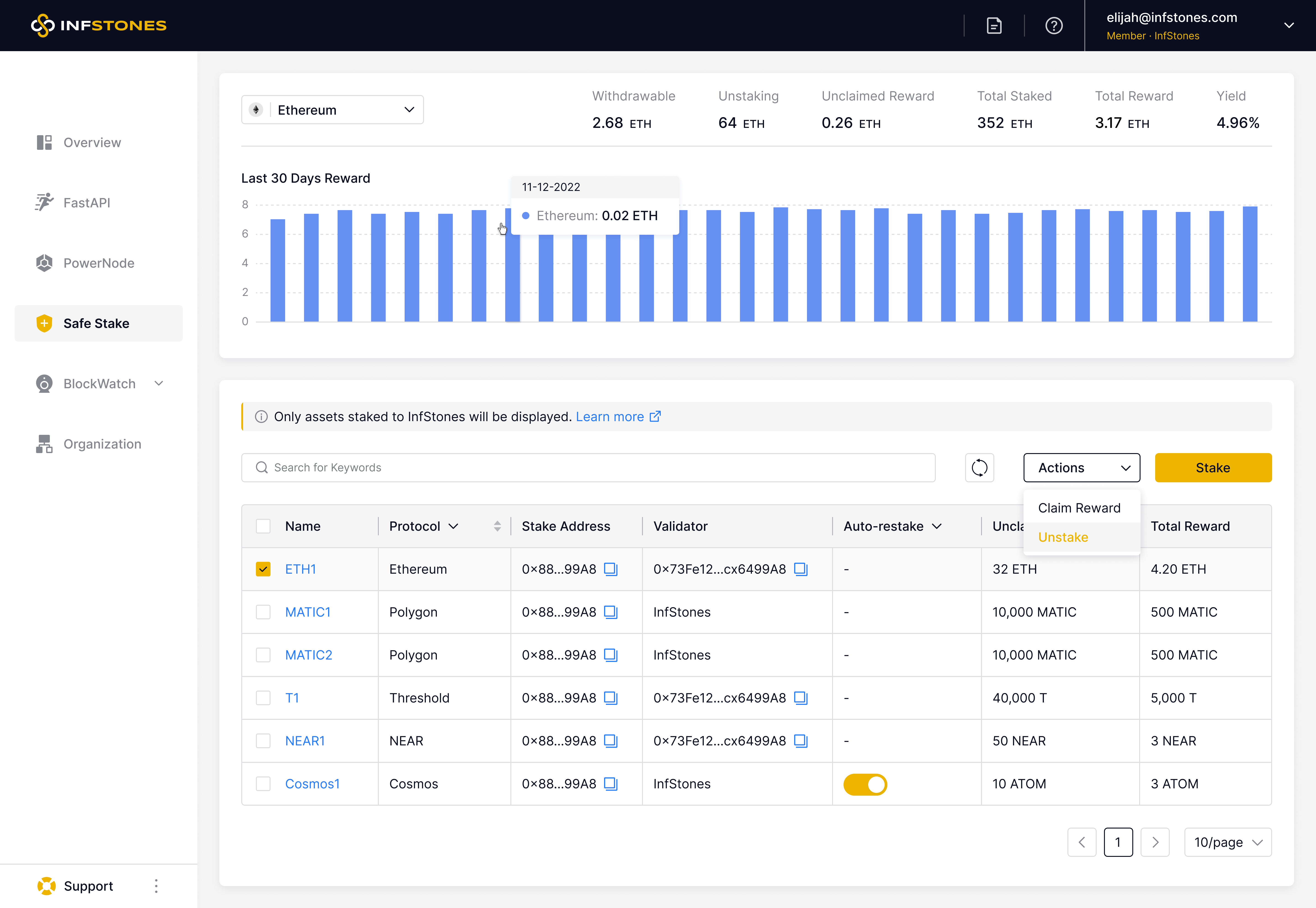 InfStones now provides an intuitive analytics feature that lets you easily access your stake, unstake, and reward histories. This feature is especially helpful for users who want to monitor their staking activity and track their rewards over time.