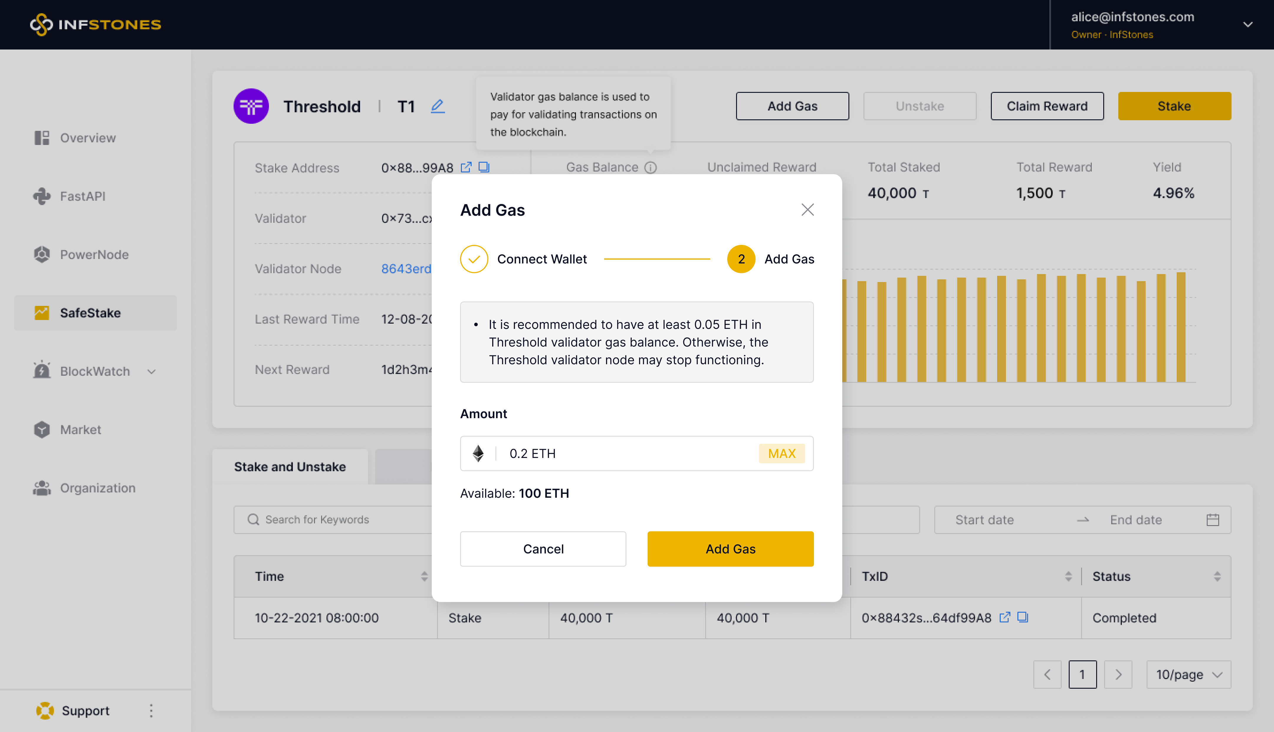 The validator gas balance is used to pay for validating transactions on the blockchain. To add gas to your threshold validator nodes, navigate to the threshold staking information page and click the Add Gas button at the top of the page, as illustrated below.