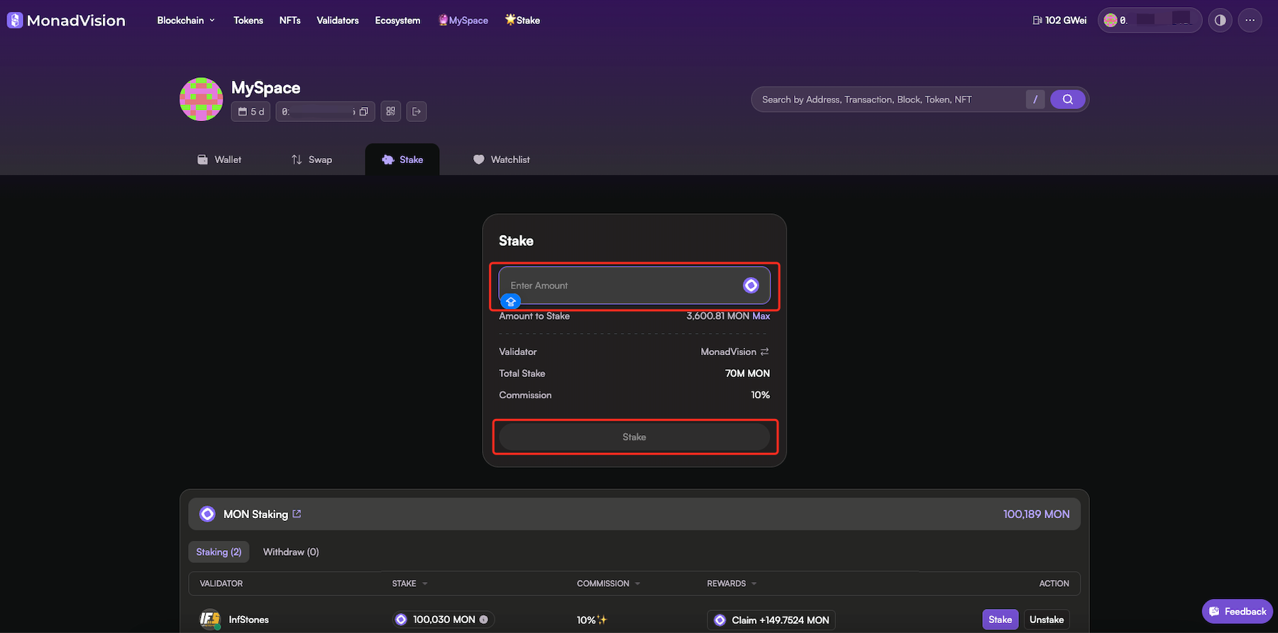 Next, enter the amount of MON to stake, and click on the "Stake" button: