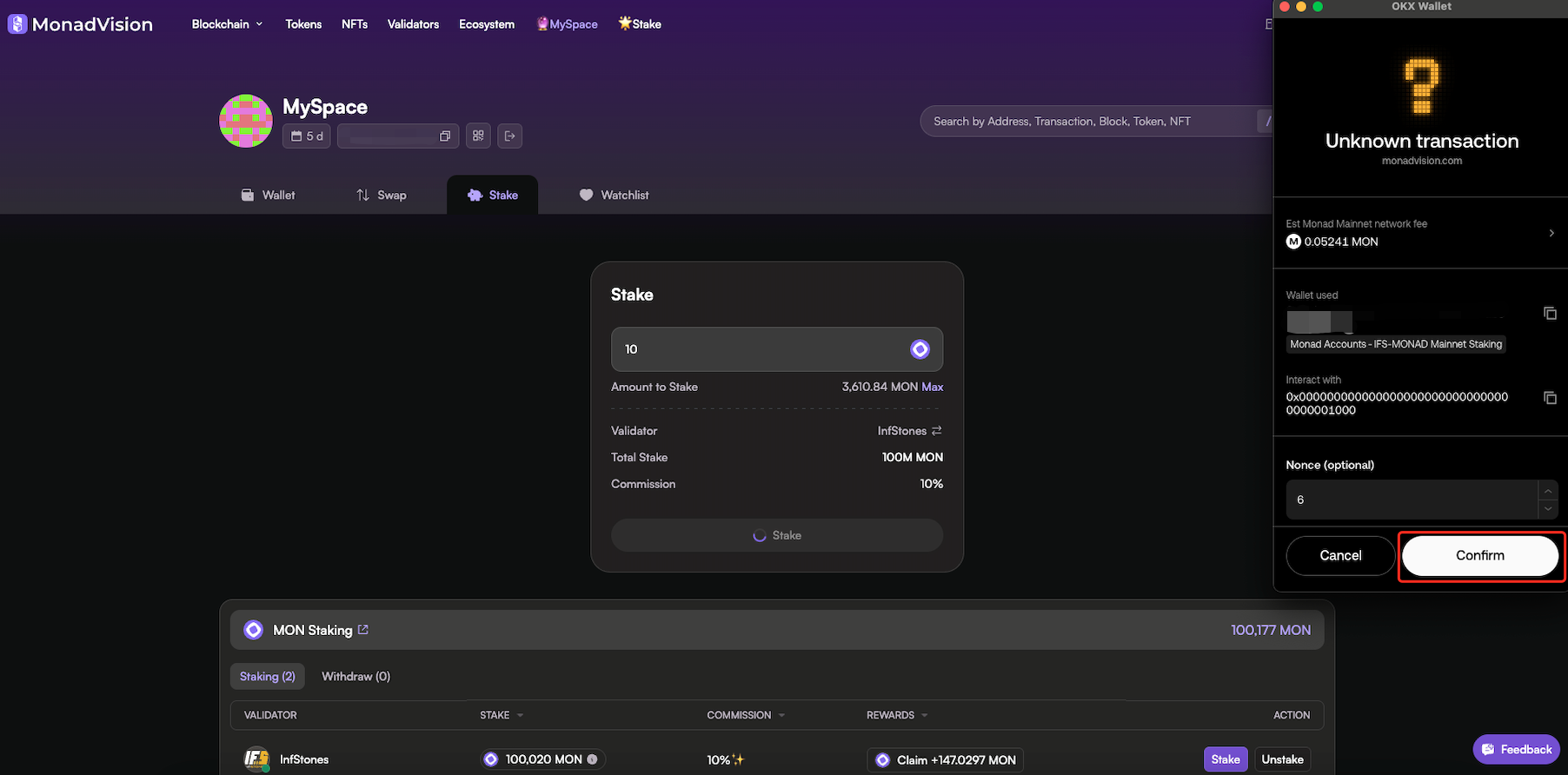 Finally, confirm the transaction as shown below. Congratulations and get ready to earn MON rewards with InfStones!