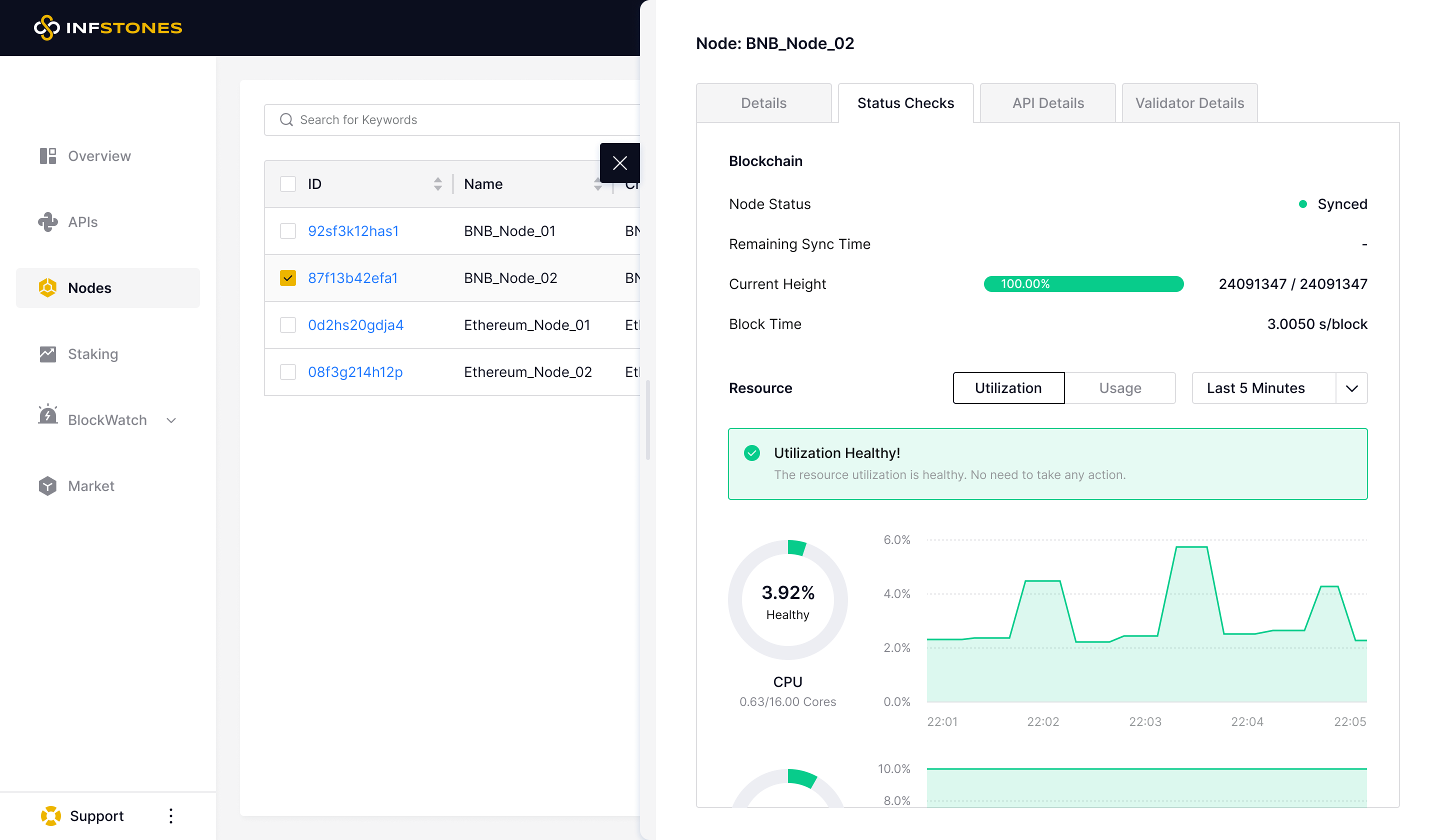 The Status Checks tab displays the status of both Blockchain and Resource Utilization.